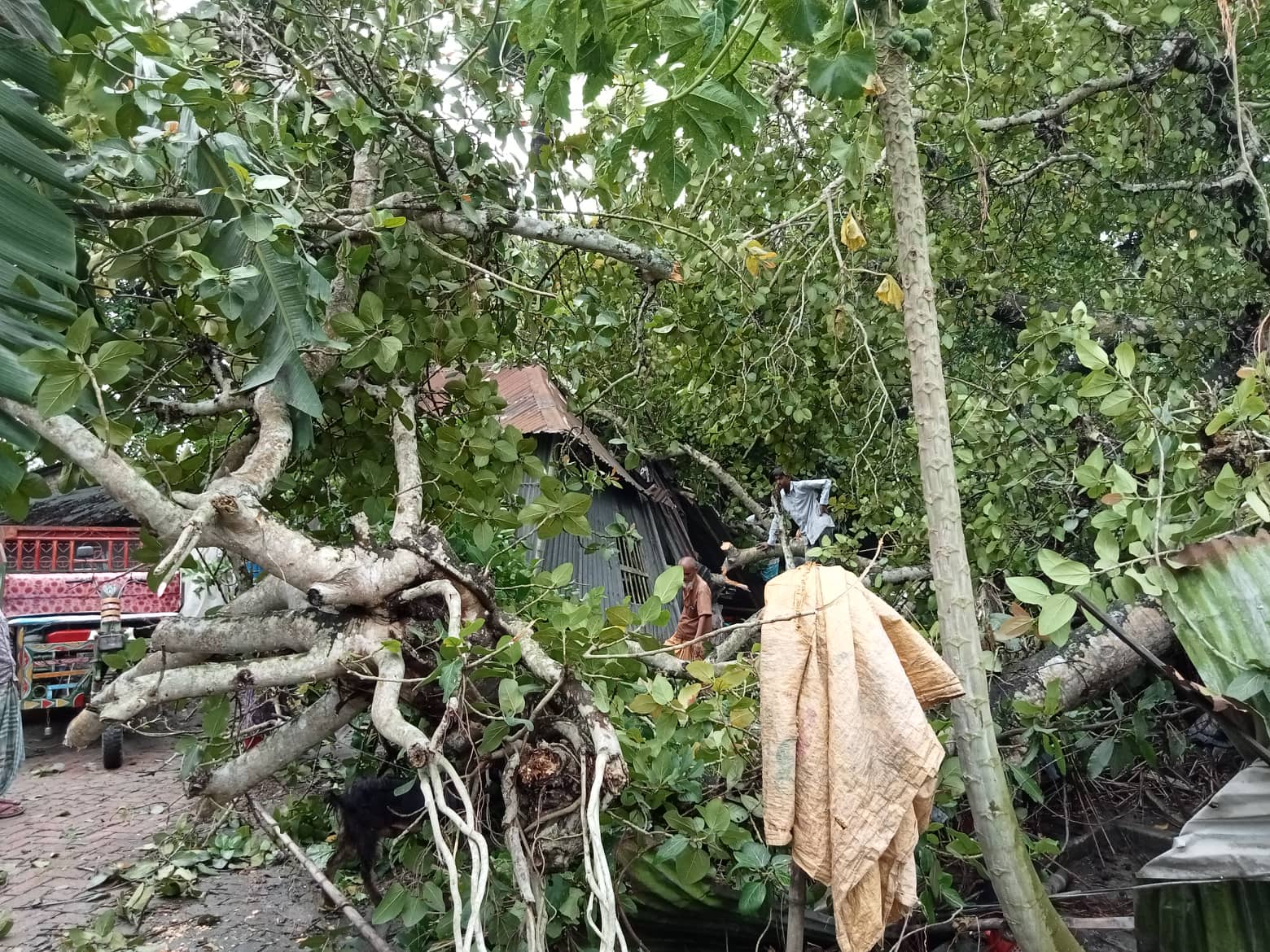 স্থানীয়রা জানান, বৃষ্টি বেশি হয়ায় খালে পানি জমার জন্য শত বছরের বটগাছ পড়ে তিনটি ঘর সহ গরুর ঘর নষ্ট হয়েছে।সকাল আনুমানিক ৫ টার দিকে বট গাছের গোড়ার মাটি নরম হওয়ার জন্য এই দূর্ঘটনাটি ঘটে।